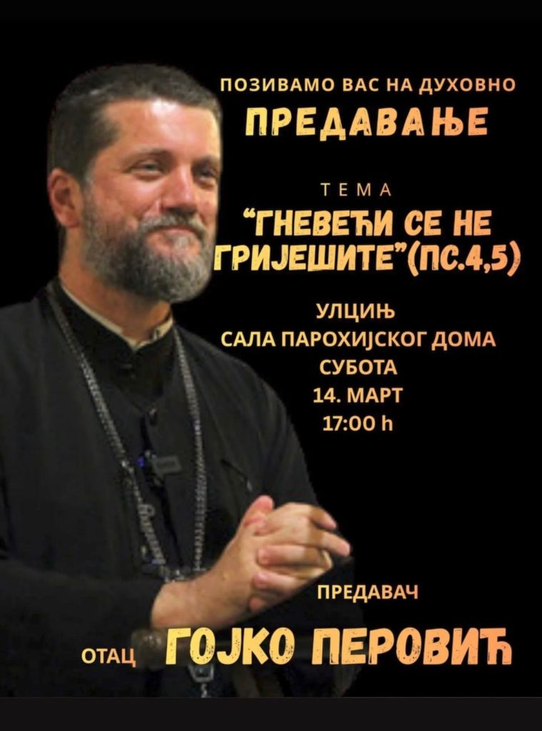 У суботу, 14. марта, са почетком у 17 часова, у парохијској сали цркве Светог Николе у Улцињу, одржаће се предавање на тему ”Гневећи се не грешите”.