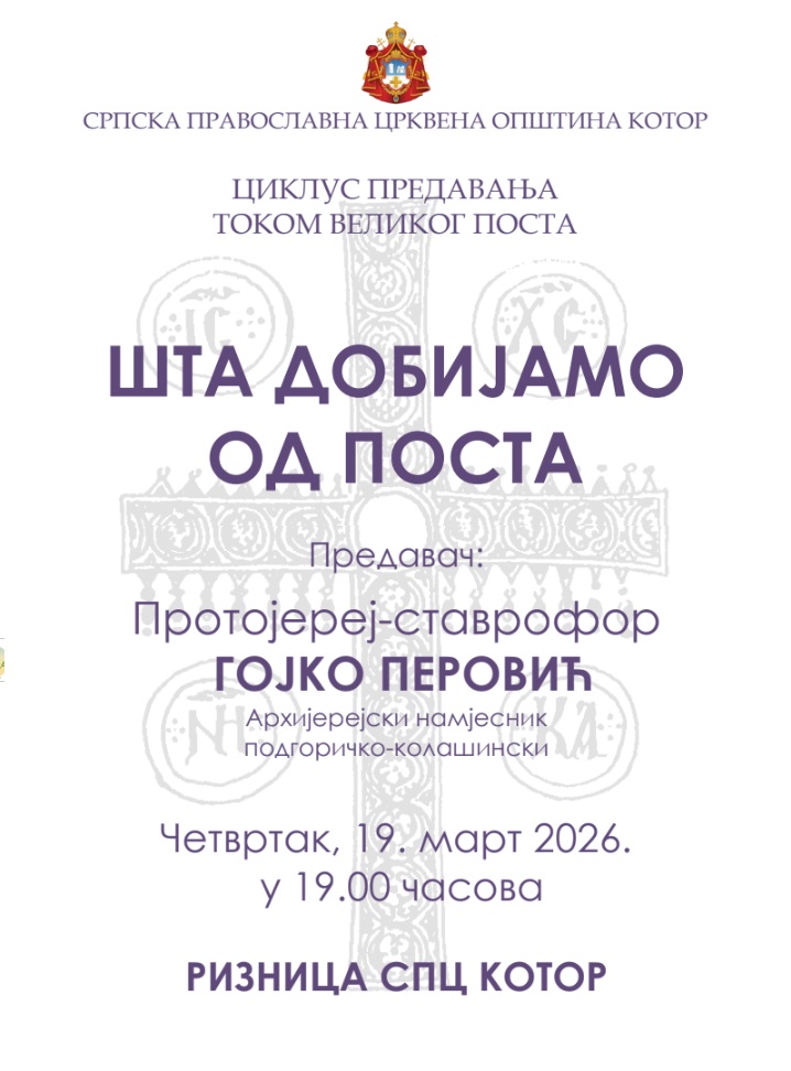У оквиру циклуса предавања током Великог поста, које организује Црквена општина Котор, у четвртак, 19. марта, у которској Ризници, одржаће се предавање на тему „Шта добијамо од поста“.