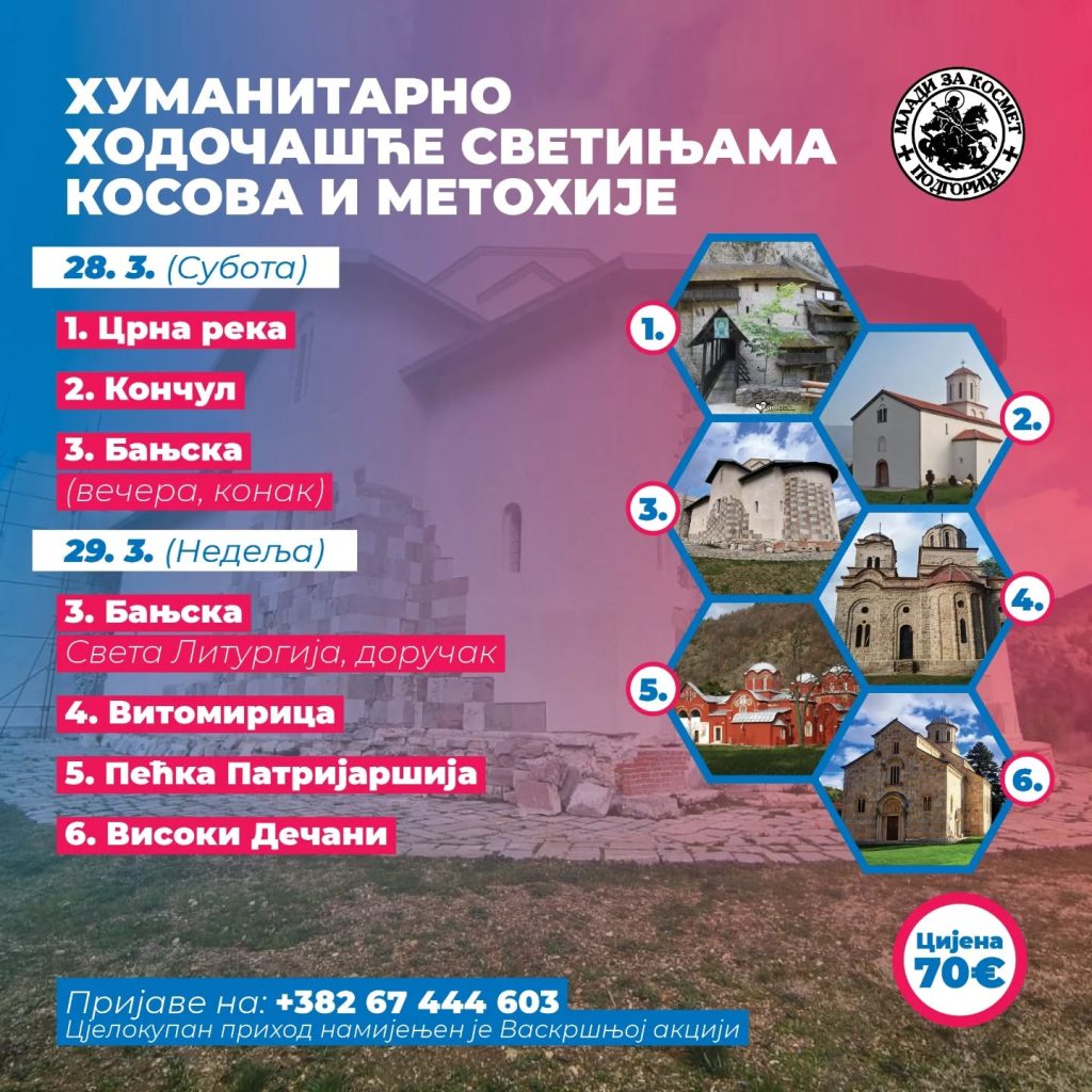 Хуманитарни омладински клуб ”Млади за Космет” из Подгорице 28. и 29. марта организује хуманитарно поклоничко путовање светињама Косова и Метохије.