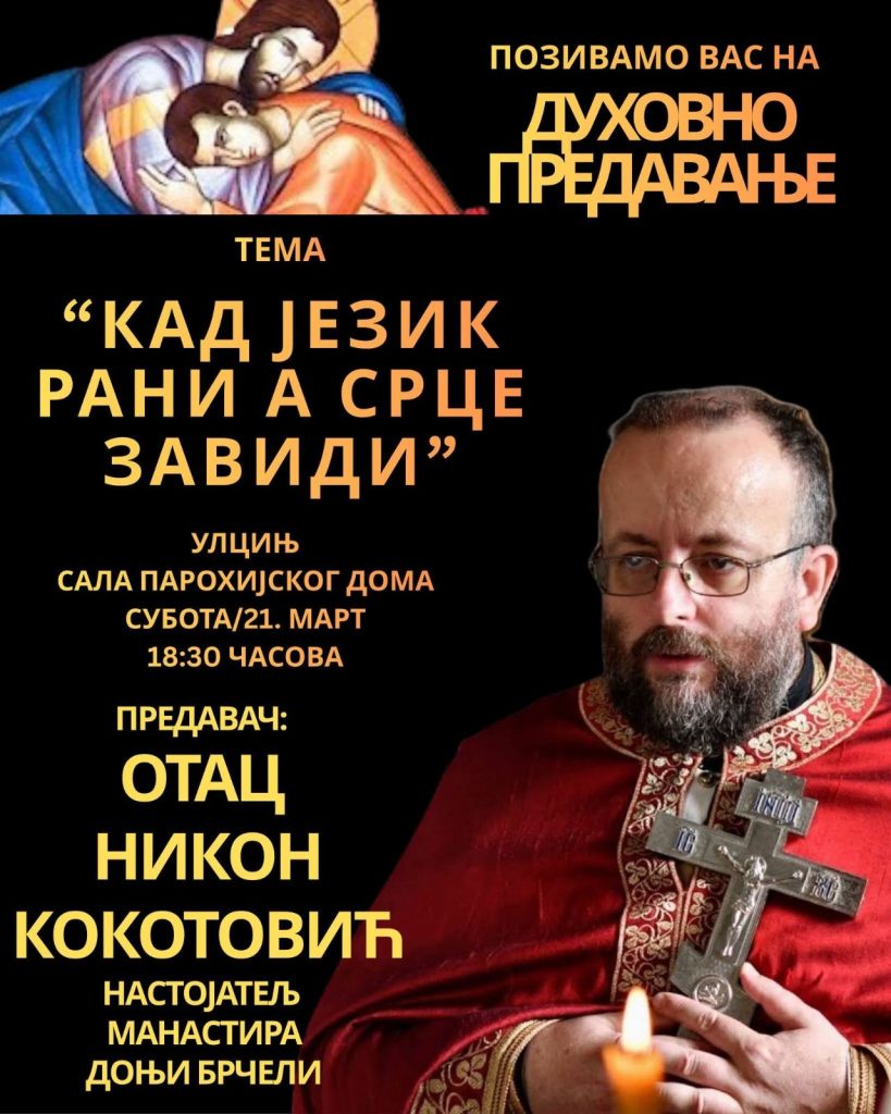 У суботу, 21. марта, у 18.30ч, у сали парохијског дома цркве Светог Николе у Улцињу, одржаће се духовно предавање ”Кад срце рани а језик завиди”.