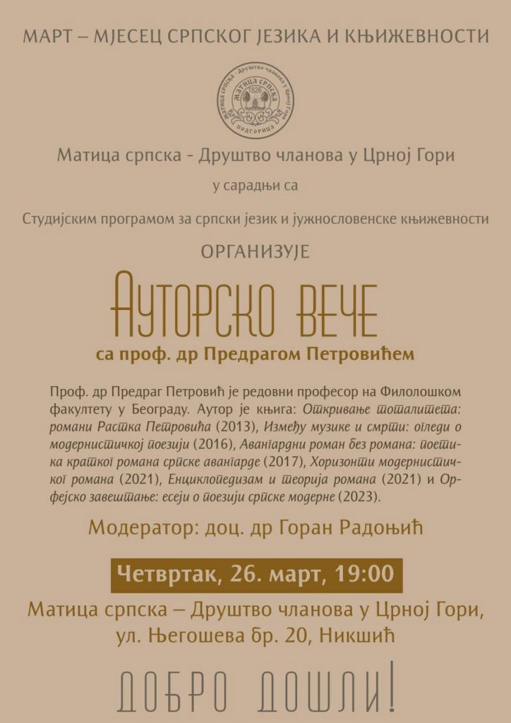 Матица српска – Друштво чланова у Црној Гори у сарадњи са Студијским програмом за српски језик и јужнословенске књижевности организује у четвртак, 26. марта у 19 часова, у својим просторијама у Никшићу, Ауторско вече са проф. др Предрагом Петровићем, редовним професором Филолошког факултета у Беграду.