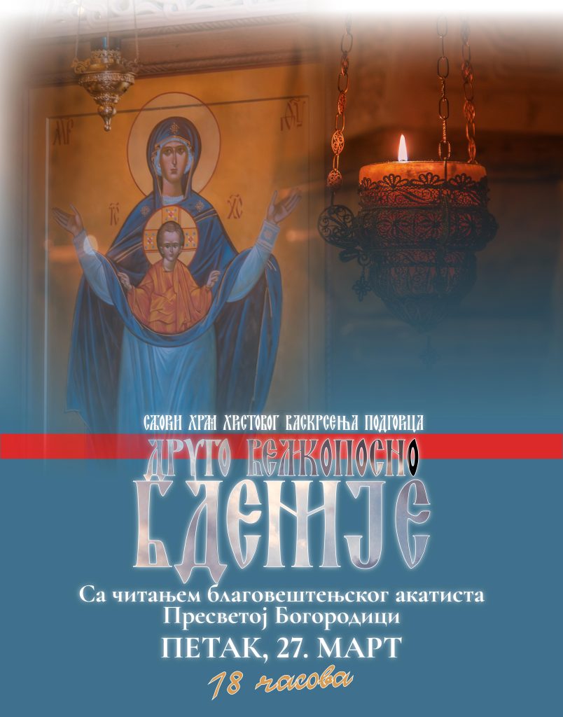 У петак, 27. марта, у Саборном храму Христовог Васкрсења у Подгорици, свештенство Храма ће уз молитвено учешће вјерног народа служити Друго великопосно бденије са почетком у 18 часова.