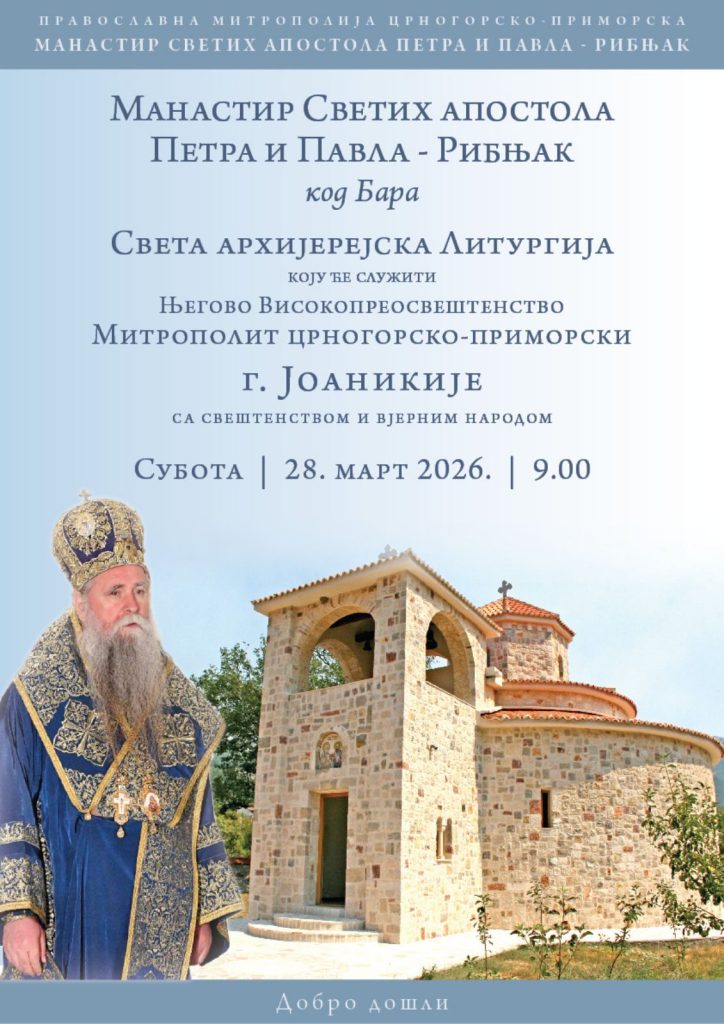Његово високопреосвештенство Архиепископ цетињски и Митрополит црногорско-приморски г. Јоаникије служиће у суботу, 28. марта, са свештенством и вјерним народом, Свету архијерејску литургију у манастиру Светих апостола Петра и Павла на Рибњаку код Бара.