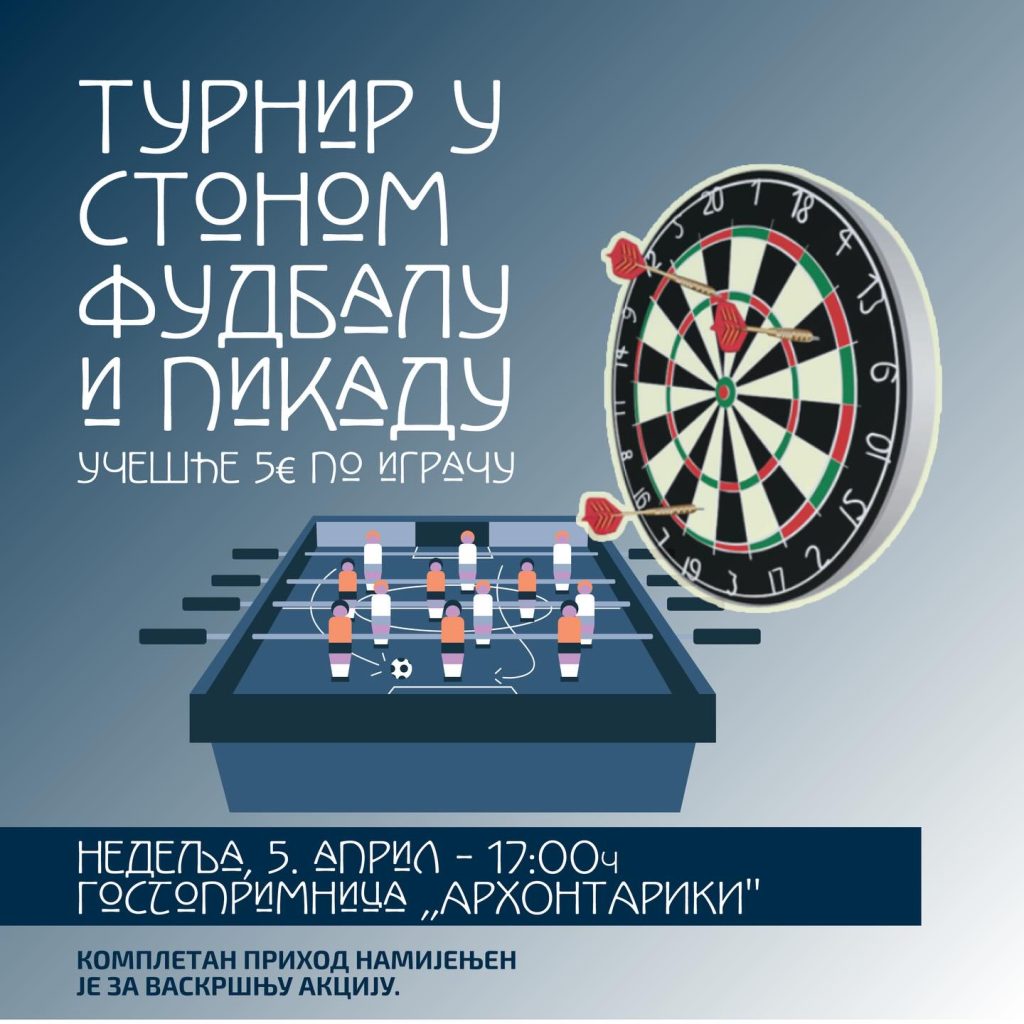 Хуманитарни омладински клуб „Млади за Космет“ из Подгорице, у оквиру Васкршње акције организује хуманитарни турнир у стоном фудбалу и пикаду.