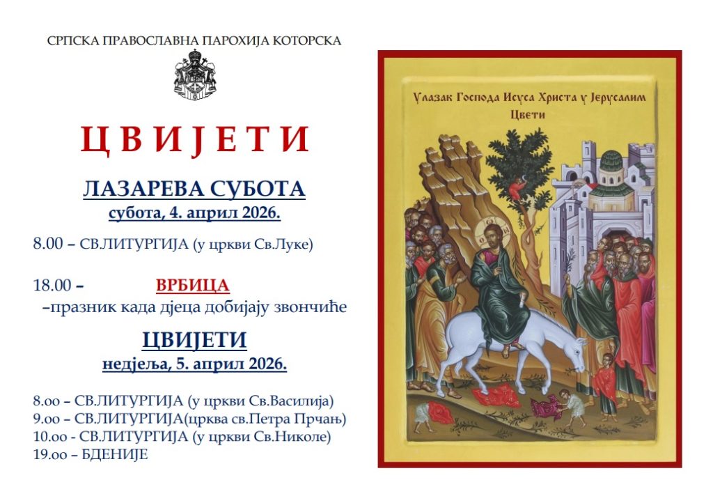Богослужења у парохији которској на Лазареву суботу и Цвијети одвијаће се по сљедећем распореду: