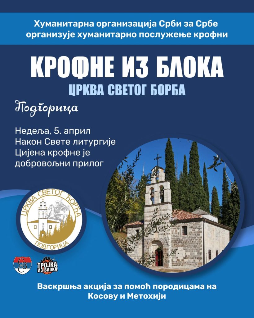 Хуманитарна организација „Срби за Србе“ у склопу Васкршње акције за помоћ породицама на Косову и Метохији , у недељу, 5. априла, реализује акцију послужења крофни у Цркви Светог Ђорђа под Горицом, након Свете литургије.