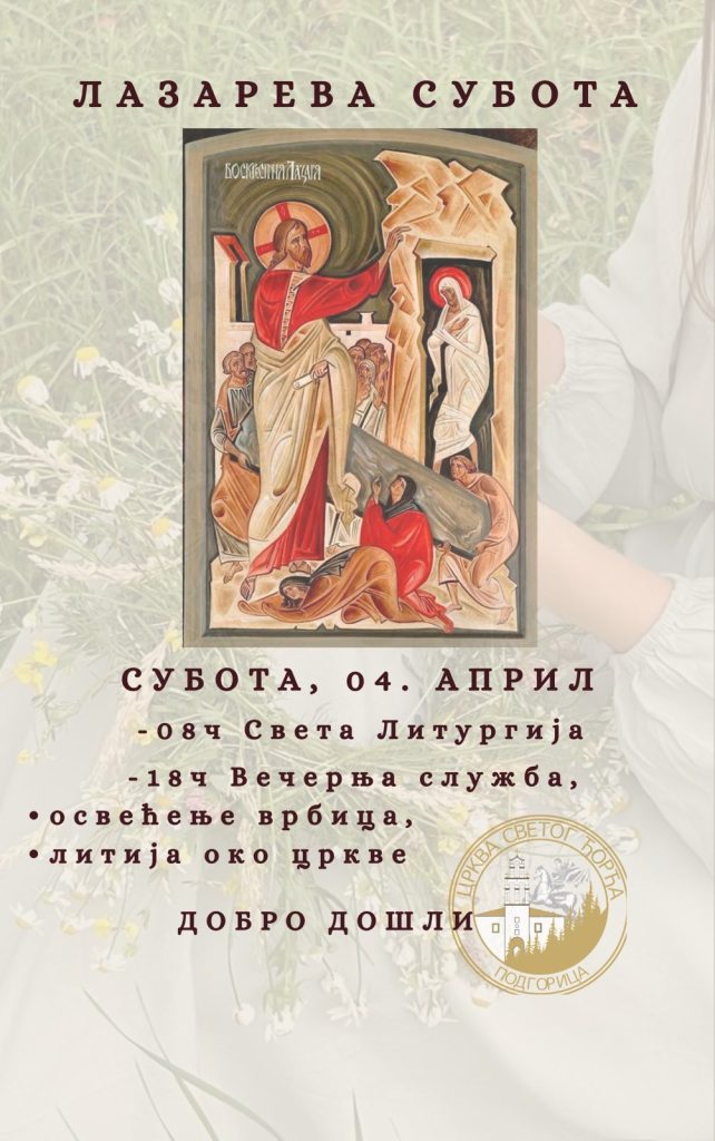 У Цркви Светог Ђорђа под Горицом, у Лазареву суботу, 4. априла служиће се Света литургија са почетком у 8 сати, а Вечерње богослужење са освећењем врбица и литијом око цркве у 18 сати.