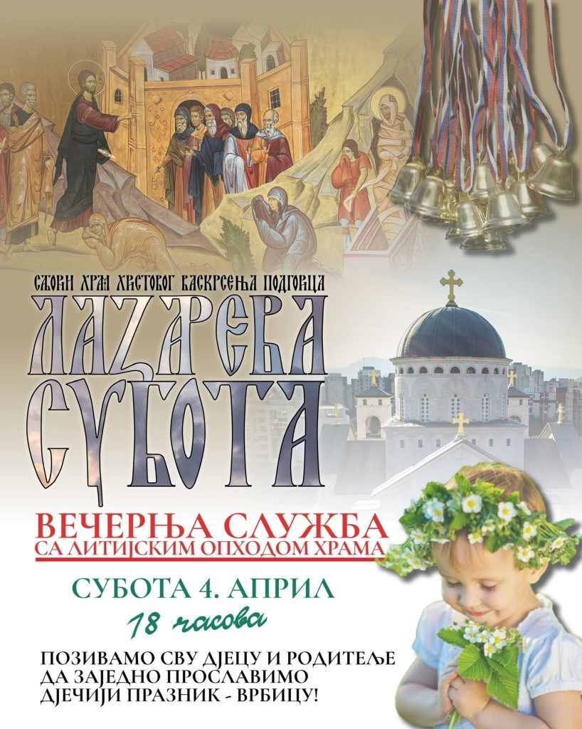 На Лазареву суботу-у навечерје празника Цвијети у Саборном храму Христовог васкрсења у Подгорици Вечерња служба са литијским опходом око Храма ће се служити са почетком у 18 сати.