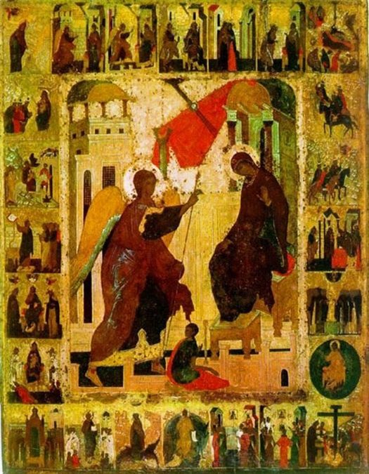 Док је она тако размишљала, и у срцу се с пламеном љубављу Господу Саваоту молила, Небески благовесник, архангел Гаврил, изненада кротко улазећи стаде пред њу…