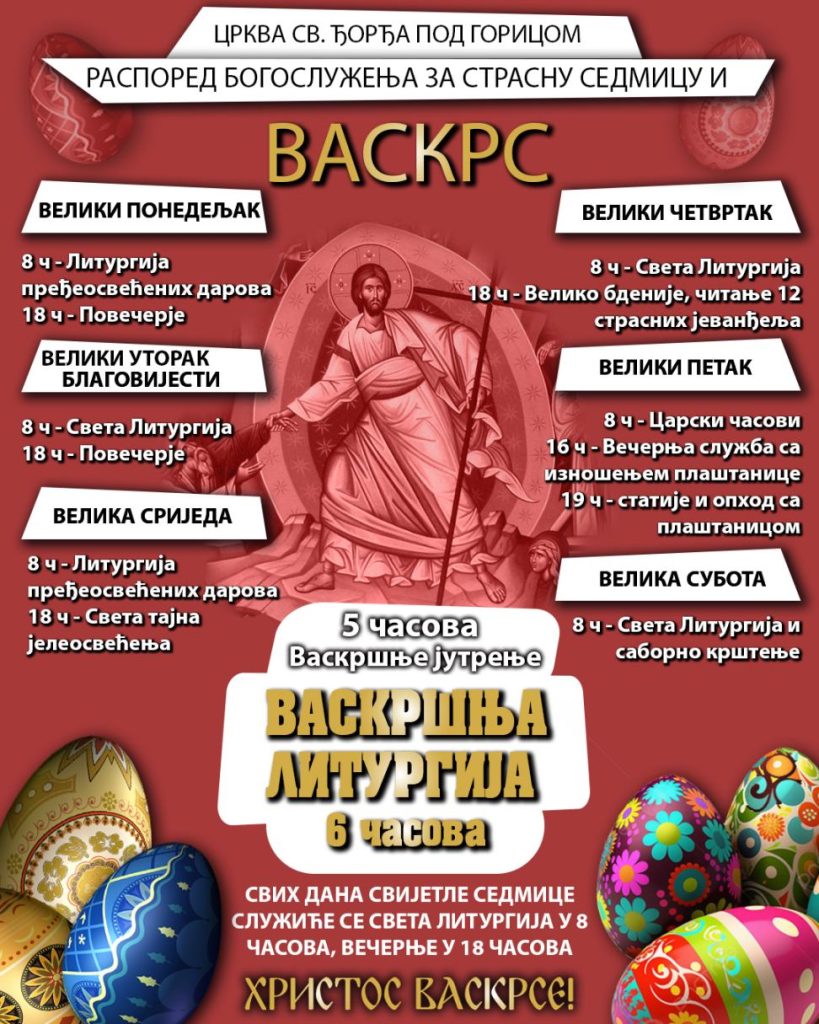 Богослужења у Црви Светог Ђорђа под Горицом у Страдалној седмици и на Васкрс, одвијаће се по сљедећем распореду: