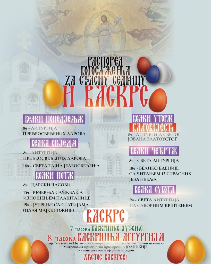 У Саборном храму Христовог васкрсења у Подгорици богослужења у Страдалној седмици и на Васкрс одвијаће се према сљедећем распореду:
