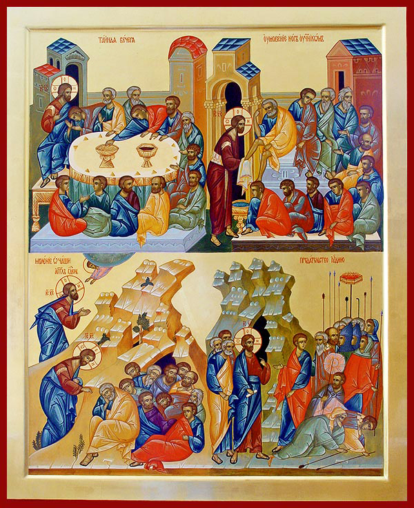 Будући да се јудејска Пасха морала учинити у петак, а пошто је приличило да истина буде у складу са праобразом, тј. да би тада и Христос био принет као пасха за нас, Господ наш Исус Христос је, по речима светих отаца, учинио Пасху са ученицима пре тога, у четвртак навече. То вече и цео петак Јудејци сматрају као један дан, јер они тако рачунају дане. Зато ју је и учинио тада, са ученицима, како кажу неки, међу њима свети Златоусти, по закону, пре свега стојећи, опојасан, у сандалама, ослоњен на жезла: дакле, онако како налаже закон, да не би био преступник закона. То је припремио Зеведеј; он је носио глинени крчаг воде, како говори Атанасије Велики, мада други имају другачије мишљење о томе. Затим, показујући ученицима то што је учињено, предаје тајну и наше Пасхе у великој горњој одаји, када је већ наступила ноћ. А кад би увече, каже се, седе за трпезу са Дванаесторицом ученика. Видиш да то није била законска Пасха: овде се седи, овде је вечера, хлеб и вода, а тамо све печено на ватри и бесквасно. Пред сами почетак вечере (тако говори свети Златоусти), Христос устаде, одложи своје горње хаљине и насу воду у умиваоник, и све то учини сам, да би тиме посрамио Јуду, а уједно подсетио остале ученике да не траже старешинство. Христос поучава ученике и након прања ногу, показавши то сопственим примером, и говори: Који хоће да буде први нвка буде последњи од свију. Изгледа да је Христос опрао ноге прво Јуди, који је безочно седео у прочељу. Петар, последњи ученик коме је Христос пришао, ватренији од осталих, брањаше Учитељу, али одмах након тога са задовољством дозволи. Кад опра њихове ноге и показа да ће се узвисити сваки онај који себе понизује, и поново узе хаљине и седе, поче да их поучава да воле један другога и не траже старешинство.