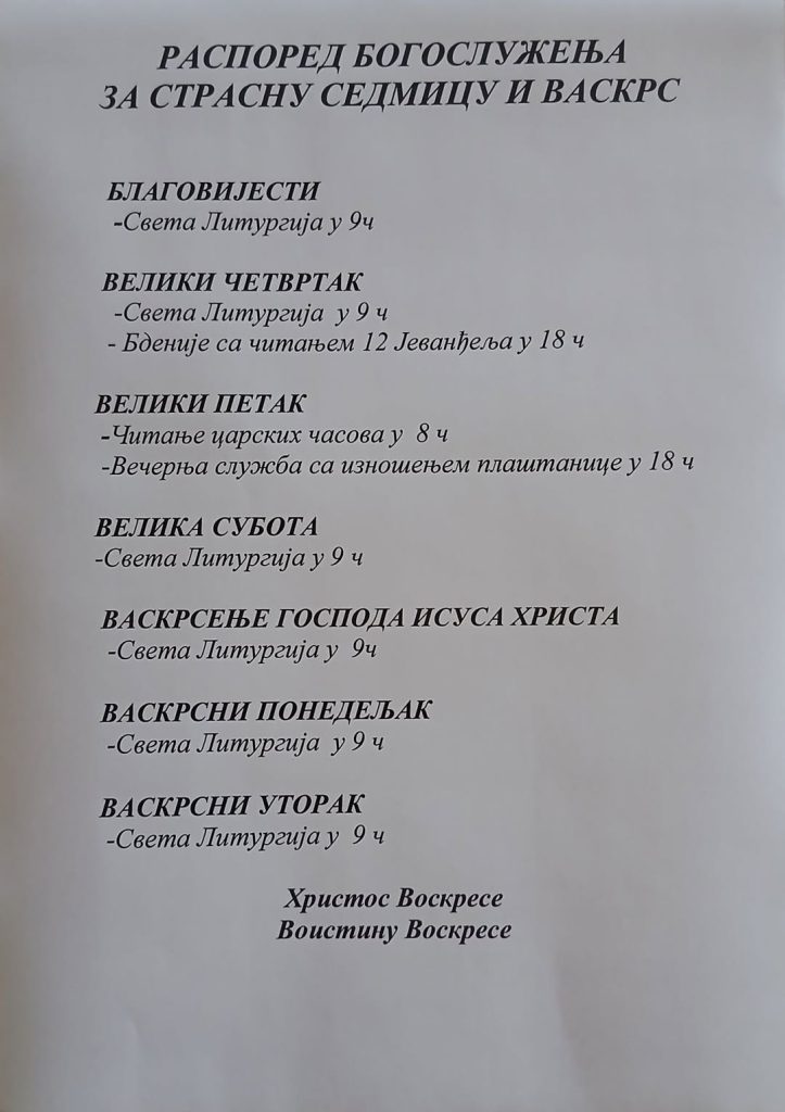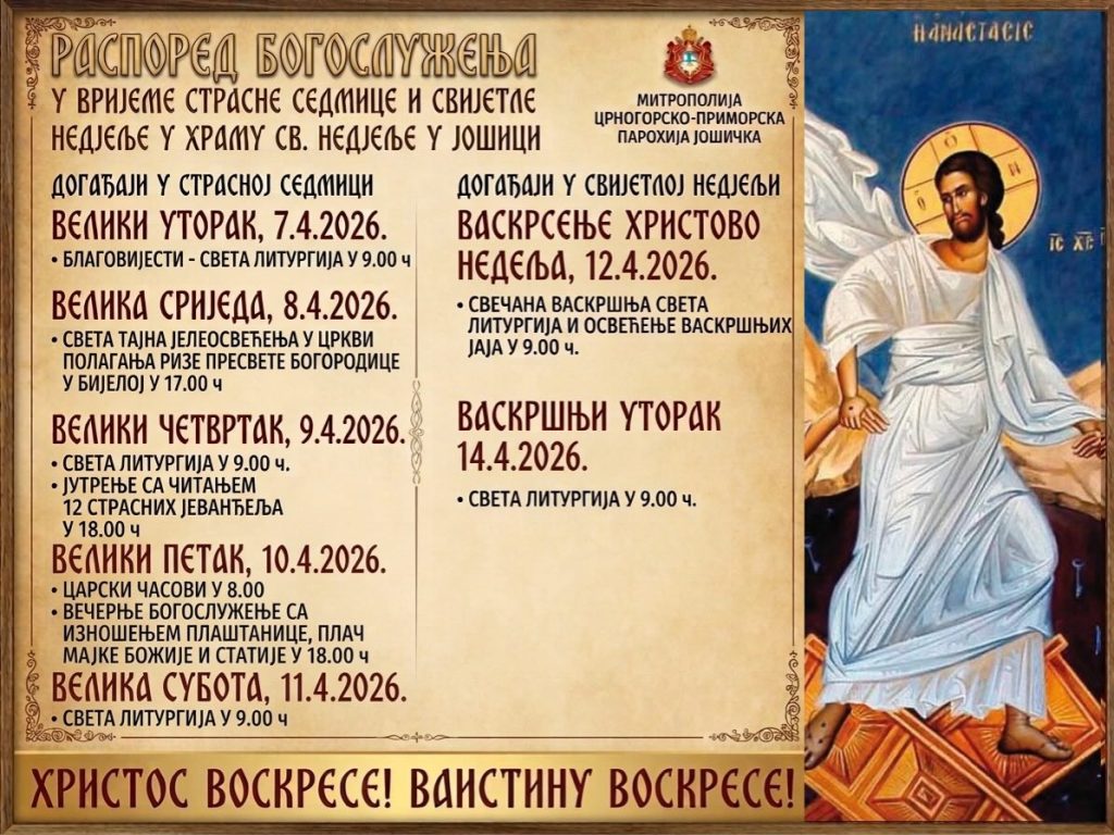 Света литургија у Цркви Свете Недјеље у Јошици у 9 сати, у наставку освећење васкршњих јаја