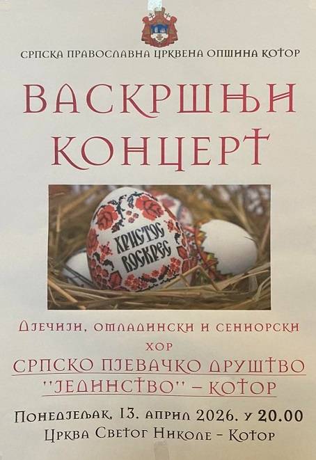 Васкршњи концерт дјечијег, омладинског и сениорског Хора Српског пјевачког друштва “Јединство” (1839) Котор биће одржан у Цркви Светог Николе сјутра,13. априла са почетком у 20 часова.