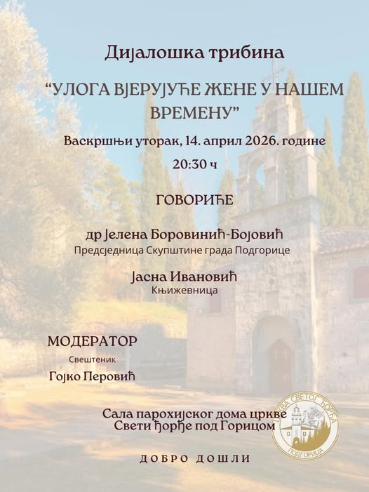 Дијалошка трибина на тему: „Улога вјерујуће жене у нашем времену“ одржаће се у сали парохијског дома Цркве Светог Ђорђ под Горицом, у Васкршњи уторак, 14. априла са почетком у 20.30 сати.