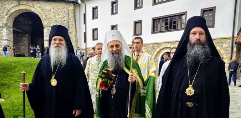 Његова светост Патријарх српски г. Порфирије служио је данас, на Васкршњи понедељак, Свету архијерејску литургију у Манастиру Високи Дечани.