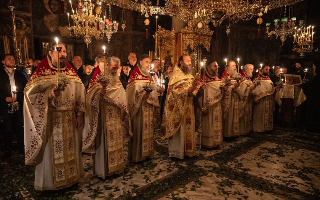 Свеноћним пасхалним богослужењем у хиландарском саборном храму началствовао је Високопреподобни архимандрит Методије, уз саслужење свештенослужитеља и братства, а у присуству многобројних ходочасника из Србије и света.