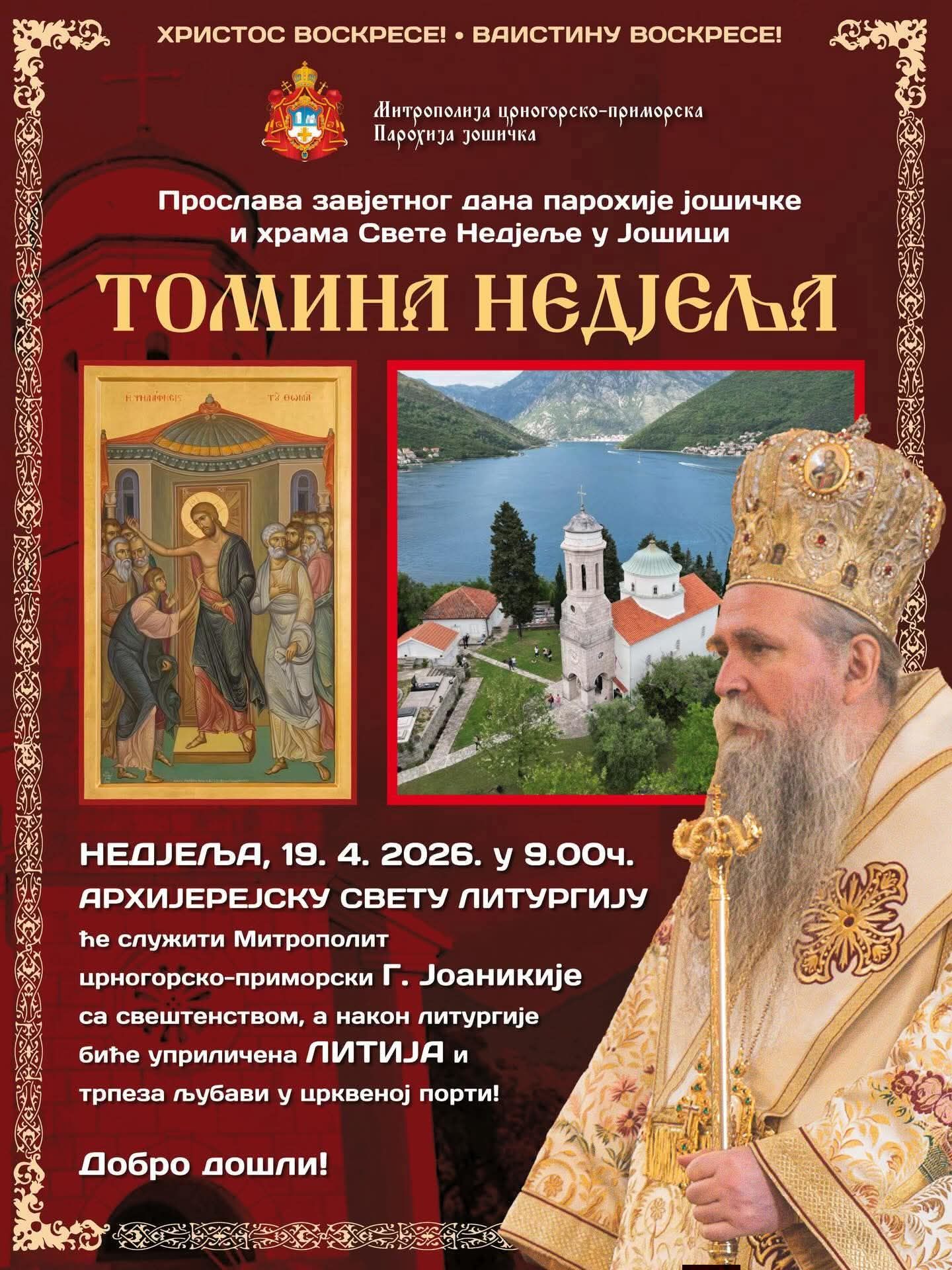 Његово високопреосвештенство Архиепископ цетињски Митрополит црногорско-приморски г. Јоаникије служиће, 19. априла, у Томину недељу, Свету архијерејску литургију у Храму Свете недеље у Јошици.