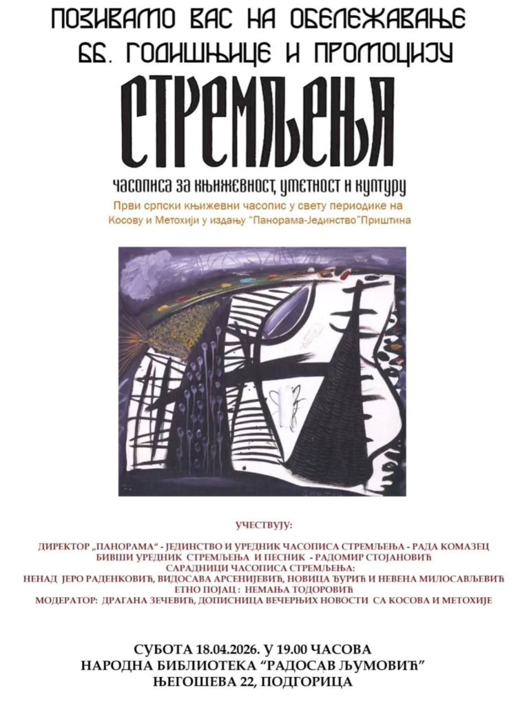 У Народној библиотеци “Радосав Љумовић” , у суботу 18. априла у 19 часова, биће организовано обиљежавање 66 година од постојања и промоција часописа за књижевност, умјетност и културу “Стремљење”.