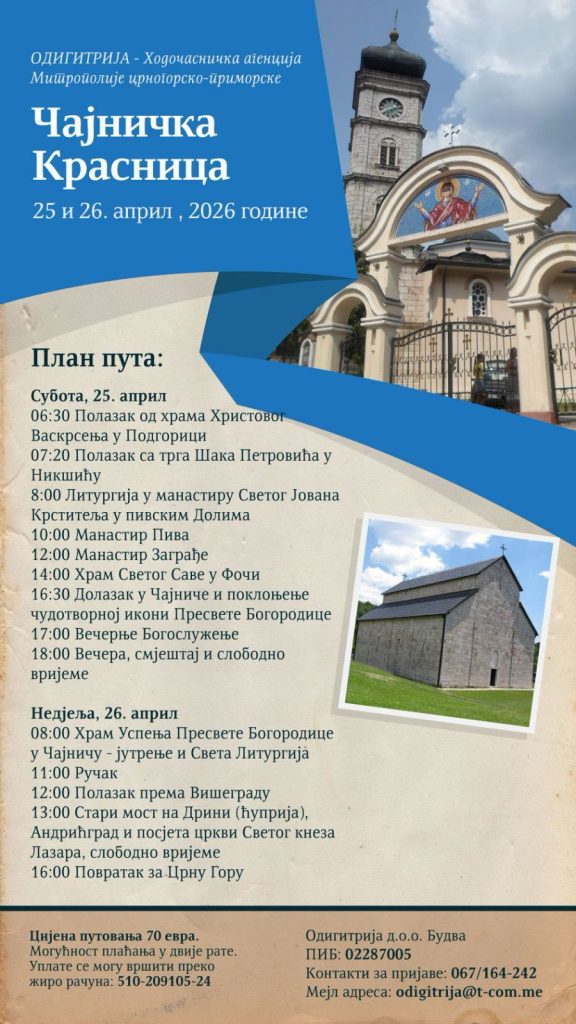 Одигитрија-Ходочасничка агенција Митрополије црногорко-приморске, 25. априла организује поклоничко путовање у Чајниче.