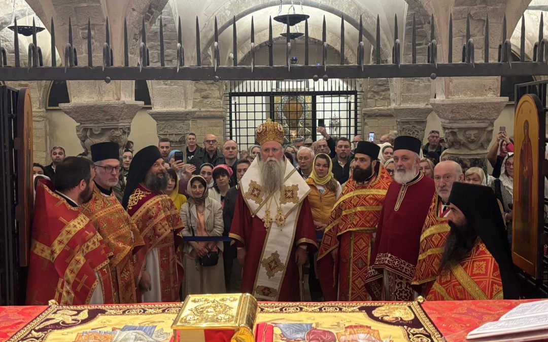 Његово Високопреосвештенство Архиепископ цетињски и Митрополит црногорско-приморски г. Јоаникије служио је данас свету архијерејску литургију, на спомен светих мученика Терентија и Помплија, 23. априла 2026. године, на моштима светог оца Николаја Мирликијског Чудотворца, у храму њему посвећеном у италијанском граду Барију.