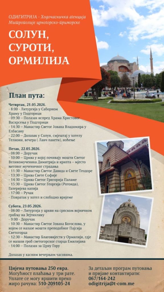 Ходочасничка агенција Митрополије црногорско-приморске „Одигитрија“ организује ходочасничко путовање у Солун, Суроти и Ормилију од 21. до 23. маја ове године.